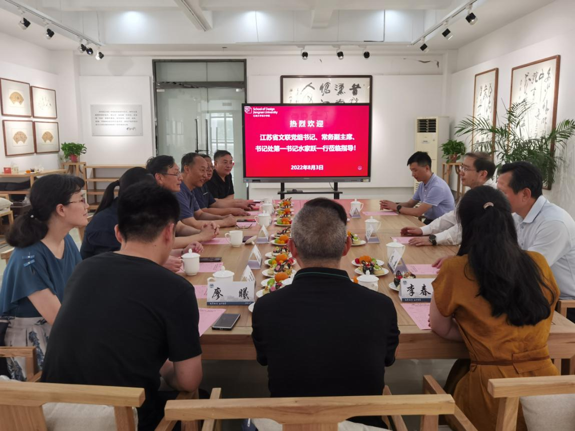 8月3日下午,江苏省文联党组书记、常务副主席、书记处第一书记水家跃一行到江南大学考察指导,在钱绍武艺术馆书法厅进行交流座谈。无锡市文联党组书记、主席杨建、无锡市民间文艺家协会驻会副秘书长阚波陪同考察,江南大学党委常委、副校长吴正国,校党委常委、党委办公室主任朱飞,设计学院党委书记邱建平,设计学院院长魏洁,社会科学处副处长杨恋恋,设计学院副院长廖曦、设计学院教授王峰、童永生、李春艳等参会。座谈会由邱建平主持。