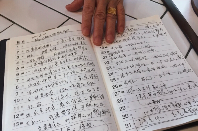 交流中,郑爷爷向团队成员展示了“光荣在党50年纪念章”以及历次学习党的理论知识的记录手稿。郑爷爷语重心长地对团队成员说道:“时代的接力棒已经传到了年轻一代的手上。你们是国家的未来,要与祖国同行,当好新时代‘答卷人’!”