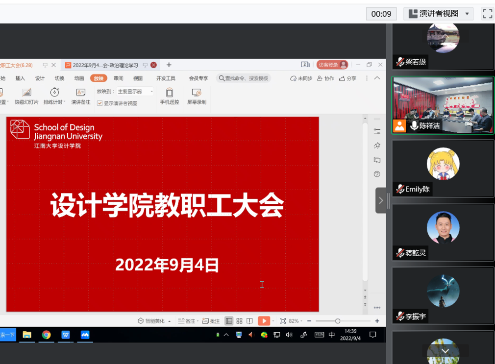9月4日下午,设计学院新学期教职工大会在线上线下召开,学院党政领导班子线下出席,全体教职工线上参会。会议由设计学院党委书记邱建平主持。