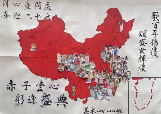美术2201班和2202班的同学们结合自己的专业特色,发挥自身所长,用画笔勾勒中国地图的一条一线,用中国红填充华夏大地的壮美河山,并将自己的Q版形象贴至自己的家乡省份,以此表达不论来自哪里,都与祖国同频共振;不论身居何处,都祝祖国繁荣昌盛的美好愿景。