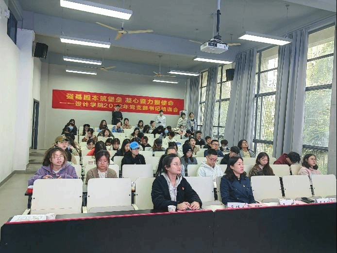 在全国上下庆祝党的二十大胜利召开之际,为加强基层党支部规范化、标准化建设,进一步提升党支部组织力、凝聚力和战斗力及党支部书记的政治素质、履职能力和工作水平,11月4日下午,设计学院于设计楼A104召开2022年秋季学期学生党支部书记培训会。会议采用线上线下相结合的方式举行,设计学院党委副书记王晖、分团委书记吴雨琛、辅导员代表及全体学生党支部书记和支部委员参会。会议由辅导员滕影主持。