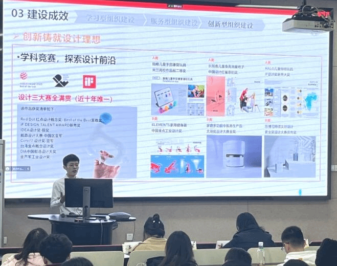 设计学院交互设计党支部作为“全国百个研究生样板党支部”介绍支部特色工作。支部组织委员赵振皓以“乘着时代的风云,以微毫诠释盛大”为题展示了支部的基本情况、建设思路和建设成效。他表示支部围绕学习型、服务型、创新型基层党组织建设,一直追求“把党支部建在专业一线”,通过“党建+专业”互融共建、同频共振,有效实现了“党建带专业,专业促党建”的耦合交融和协同发展。最后,他鼓励各支部要将学科特长融入党建之中,以创新助力设计理想,助力大国重器,弘扬设计青年之声。