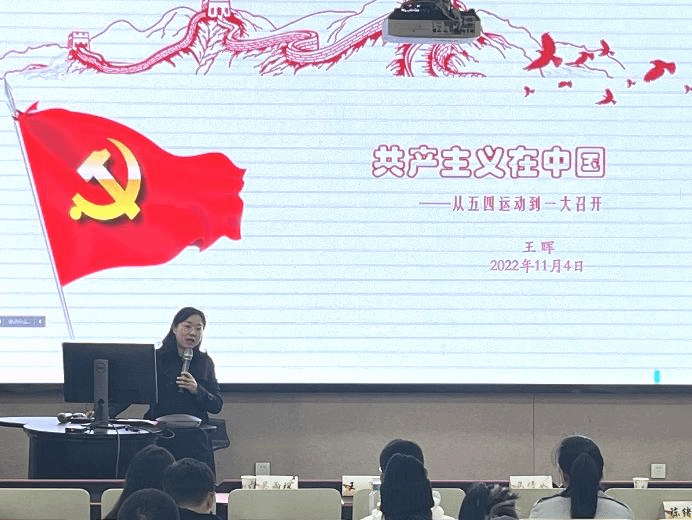 会议最后,王晖为与会人员带来一节精彩的微党课。她以叙事的方式带领全体师生回到百年前,感受共产主义在五四运动到中共一大召开这段历史中的独特魅力,重温中国共产党诞生早期的艰辛历程,聆听那个时代青年的呼声,从中获取对当代青年党员的重要启示。她带领大家重温习近平总书记在二十大报告中对青年的殷切期望,勉励各位同学要充分发挥先锋模范作用,深刻牢记青年、党员、设计人的使命,自觉强化立足中国面向世界的问题意识,将一代代青年赓续传承的红色基因转化为成长成才的扎实本领,在中华民族伟大复兴的新征程上跑出当代设计青年的最好成绩!最后,她结合会议整体内容对各位学生党支部书记提出三点要求:一是做政治上的明白人,拧紧支部全体党员的思想“总开关”;二是做支部工作的内行人,挥好支部规范化、标准化建设的“指挥棒”;三是做引领支部发展的带头人,奏响当代青年许党报国的“最强音”。