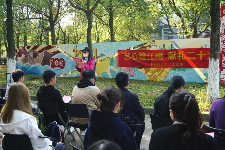 为全面学习、深入领悟、认真贯彻党的二十大精神,11月24日,设计学院本科联合第二党支部开展“艺心绘江南”庆祝党的二十大主题活动,学生围绕“非凡十年”主题进行涂鸦绘画。设计学院院长魏洁、关工委老同志兼职组织员谢翠林、教工党支部书记吴佑昕、党委委员崔华春及本科联合第二党支部全体成员参加活动,活动由本科联合第二党支部党支书张凌雁主持。