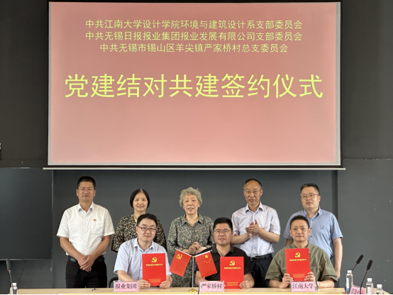 6月15日,江南大学设计学院环境与建筑设计系党支部、无锡日报报业集团报业发展有限公司党支部、无锡市锡山区羊尖镇严家桥村党总支结对共建签约仪式在严家桥村举行。江南大学原副校长王武,校党委常委、统战部部长朱飞,设计学院党委书记王维青,无锡日报报业集团党委委员、纪委书记李立群,无锡日报报业集团报业发展有限公司总经理孙廷栋,羊尖镇党委副书记余宏伟,羊尖镇党建科科长沈艳红,以及签约三方支部党员共同参加,仪式由羊尖镇党委委员陆晓伟主持。