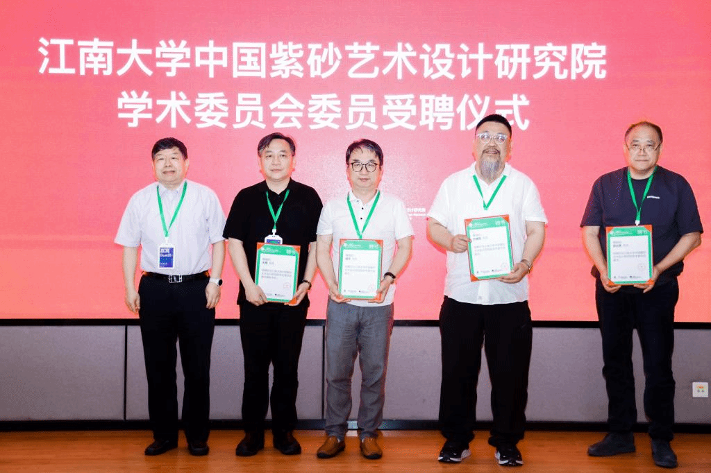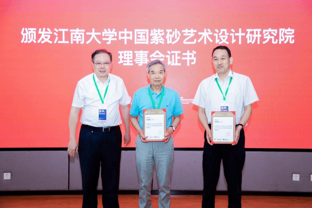 设计学院教授邓嵘和吴祐昕诵读了由设计学院副教授代福平撰写的《弘陶馆记》。活动期间,同步举行了江南大学中国紫砂艺术设计研究院学术委员会与理事会成立仪式暨客座教授和兼职硕士生导师授聘、大师工作室授牌仪式。