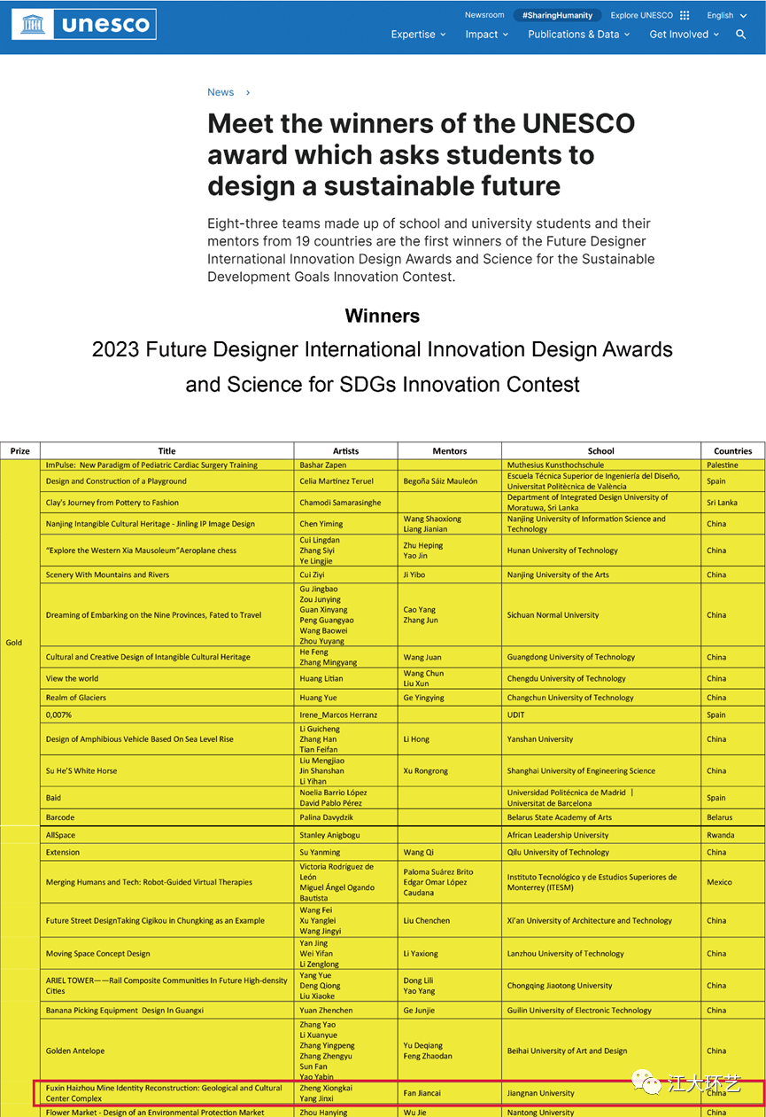 近日,联合国教科文组织公布了2023首届未来设计师·国际创新设计大赛暨科技赋能可持续发展创新大赛获奖名单,来自20多个国家的83支大学生代表队获奖,包括25个金奖,29个银奖和29个铜奖。来自江南大学设计学院环境设计系研究生郑雄凯、杨金曦(Zheng Xiongkai, Yang Jinxi)的作品《Fuxin Haizhou Mine Identity Reconstruction: Geological and Cultural Center Complex》获得了金奖。未来设计师·国际创新设计大赛暨科技赋能可持续发展大赛(International Innovation Design Awards, IIDA & Science for SDGs Innovation Contest)由联合国教科文组织与IIDA组委会主办,向世界各地的年轻人征集创新和创意作品,促进和倡导科学、工程和STEM在可持续发展目标中的重要作用,帮助青年人拓展国际视野,助推可持续发展。竞赛收到了来自48个国家和地区近1500个队伍参赛作品。未来设计师NCDA大赛是中国唯一的选拔赛,获得2023第11届未来设计师NCDA大赛国赛一、二等奖的作品有资格参赛。经过初选,共228件作品进入最终决赛,产生了83个奖项。赛事评委来自艺术、设计、科学,工程领域的专家,有联合国官员,大学教授和行业人员。