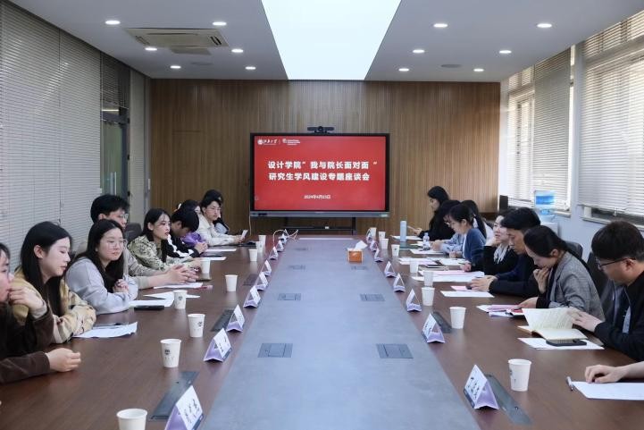 近日,江南大学设计学院举办“我与院长面对面”研究生学风建设专题座谈会。设计学院学院党委副书记江琳娜、副院长廖曦、分团委书记吴雨琛、全体研究生辅导员以及研究生代表参加座谈交流,设计学院研究生会执行主席张晨薇主持。
