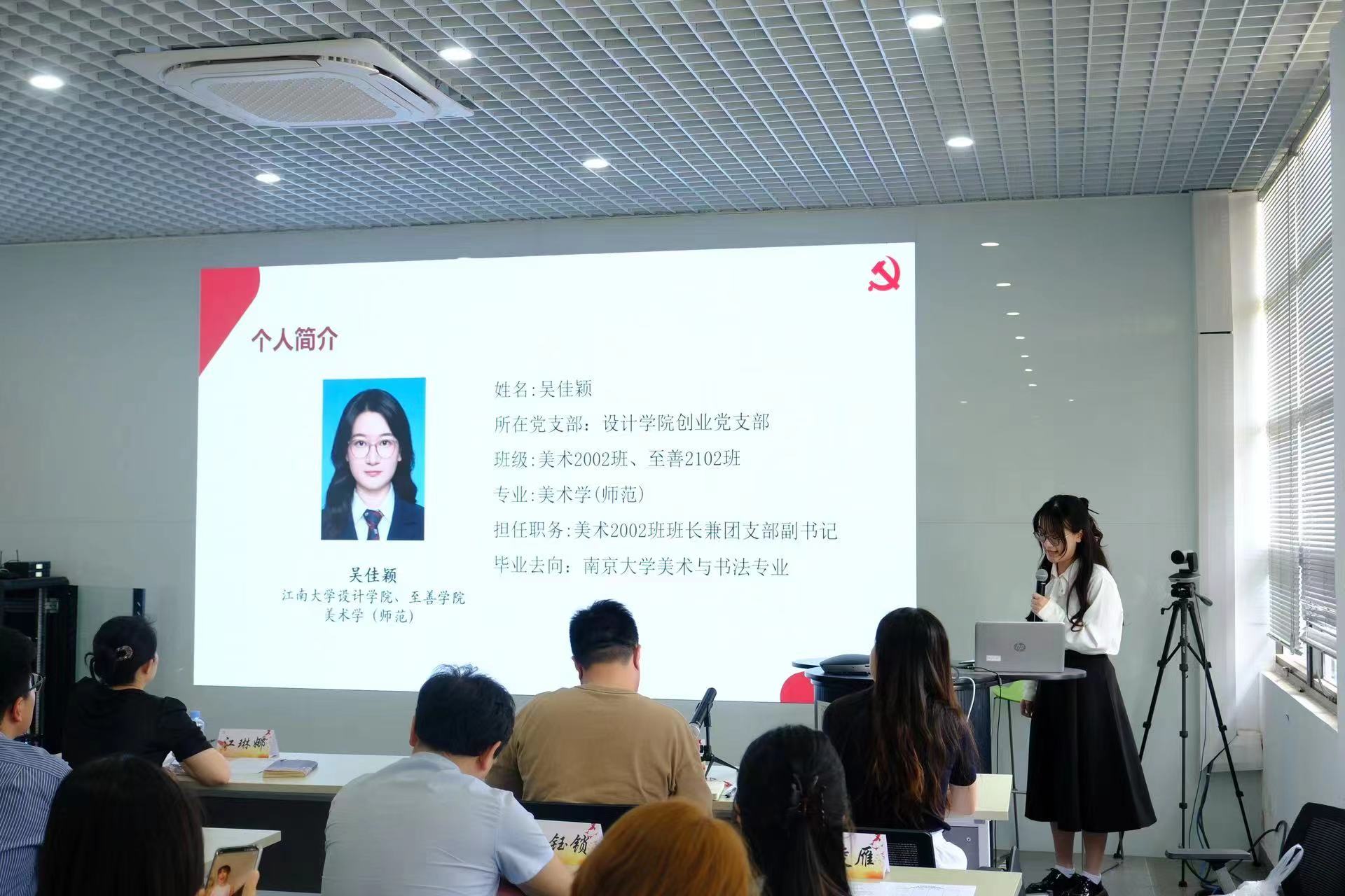 紧接着,由15名预备党员依次进行汇报。预备党员们通过生动的语言,结合真实的经历,向党组织汇报了自己在预备考察期内思想、学习和工作等方面的成长与自身存在的不足之处,表明了自己为人民服务的端正态度和为中华民族伟大复兴中国梦添砖加瓦的决心。他们中有的发表多篇学术论文并获得了国际奖项;有的参加了设计类学科竞赛并荣获国家级、省级一等奖;有的在华为工业设计部门进行了3个月的实习工作;有的获得江南大学一等奖学金并保送至南京大学;有的担任班长,获得过江南大学优秀学生干部、三好学生、优秀团员称号;有的积极参加志愿服务,以实际行动服务社会,践行党的初心使命。他们表示,在接下来的生活中将继续接受党组织的培养考察,会继续按照党员的标准严格要求自己,不断加强自身对政治理论和党性知识的学习,提高自身综合素质,牢记全心全意为人民服务的宗旨,早日成为一名合格的共产党员。