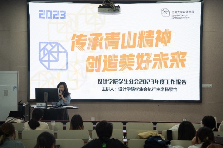 设计学院学生会执行主席杨景怡作设计学院学生分会2023-2024学年工作报告。她强调全心全意服务同学的学生会工作宗旨,同时发扬设院的创新力、想象力、执行力。然后从树立思想明灯,引领青年方向;加强榜样引领,服务成长成才;打造品牌活动,畅通宣传合作这三方面对2023年度工作进行了工作报告,详细阐述了学院学生会的组织架构体系和品牌特色活动。