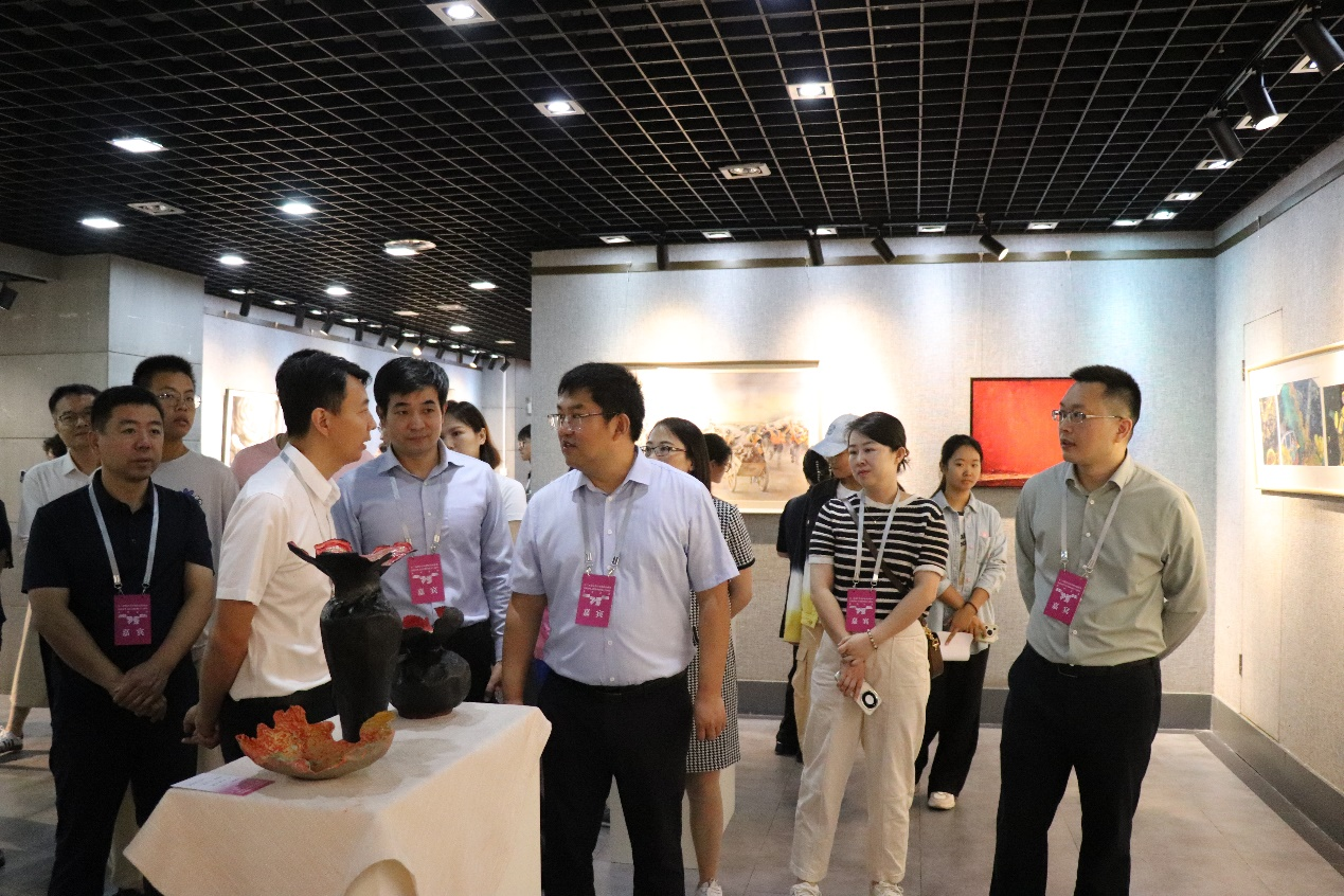 最后长三角设计学科党建高校联盟各高校成员参观“七十五载风华颂,墨启创设新征程”——庆祝新中国成立75周年师生作品巡展,本次巡展是长三角设计学科党建高校联盟单位落实“党建+美育”的生动实践。活动以反映时代风貌、彰显时代精神为创作指向,共征集长三角地区10所高校艺术与设计学科师生创作的书画、摄影、动漫、文创及雕塑等门类艺术作品130余件,其中江南大学作品共15件。这些作品以艺术的方式充分展示新中国成立75年以来的新面貌、新成就。参展师生们用自己的艺术创作,抒发了内心对中华民族以及中国共产党的无限热爱,对实现中华民族伟大复兴中国梦的坚定信心。