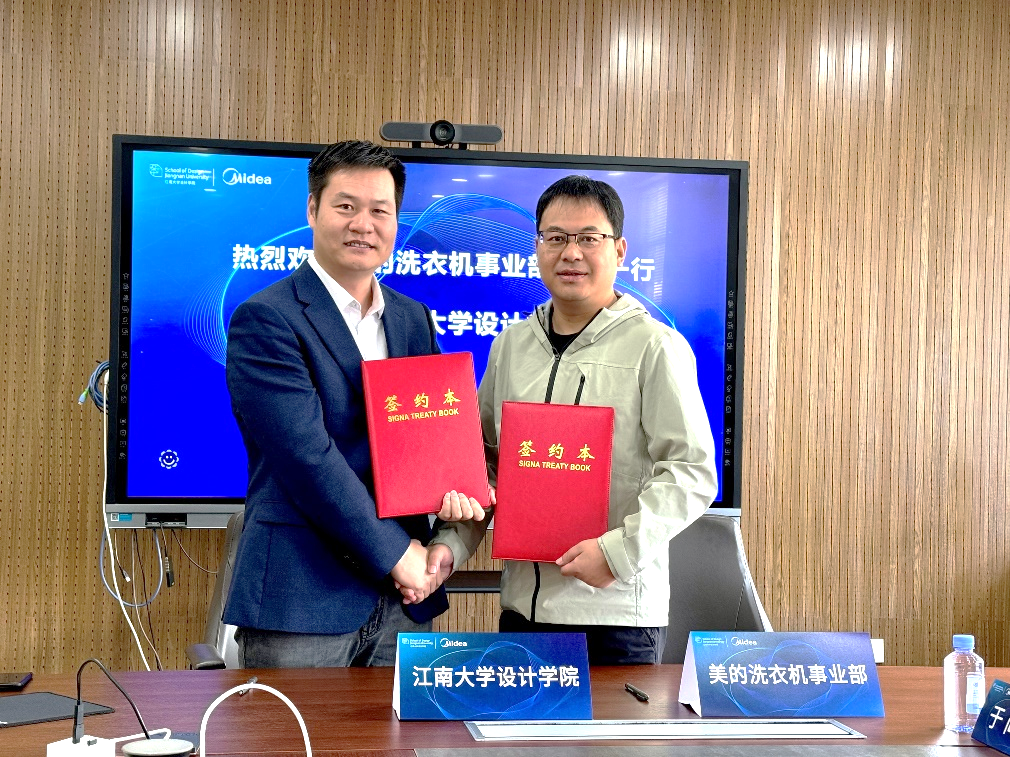 会上,胡伟峰代表学院对王海峰一行表示热烈欢迎。他从设计学院近年来的学科建设、科学研究等方面介绍学院发展情况,他指出,江南大学设计学院与美的集团洗衣机事业部渊缘深厚,双方合作交流紧密,历年来在产学研合作、协同育人等方面取了良好的成效,希望今后在AI时代数智科研方面深化互惠合作、共建联合科研实践基地。王海峰表示希望企业与高校双方能充分发挥彼此优势,共建数智研发实验室,企业愿提供研究实践平台,为高校教学科研工作提供实战机会,更快推动数智新质生产力的发展。随即美的集团洗衣机事业部与设计学院签订了表明长期战略合作意向的校企合作、协同育人数智联合实验室共建协议。