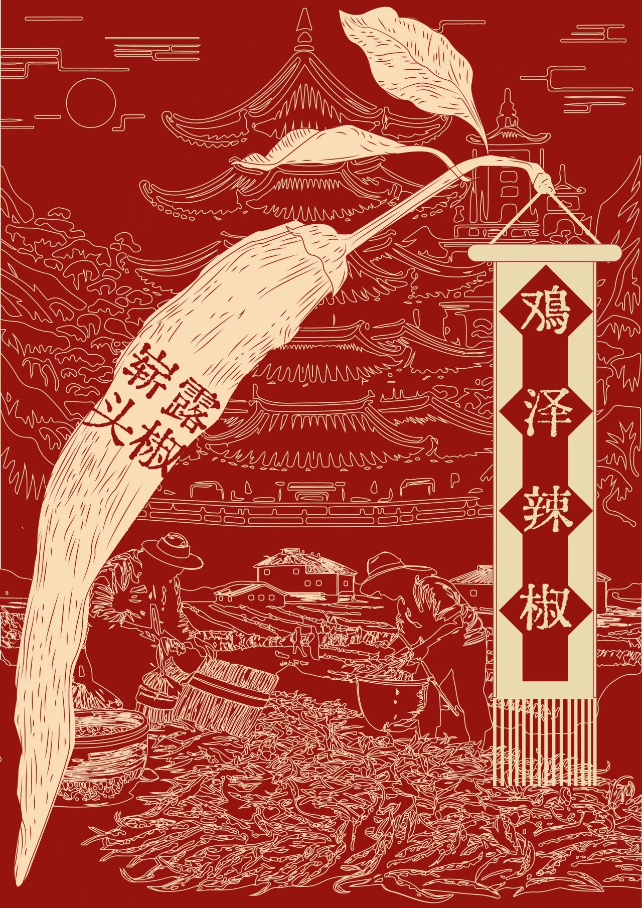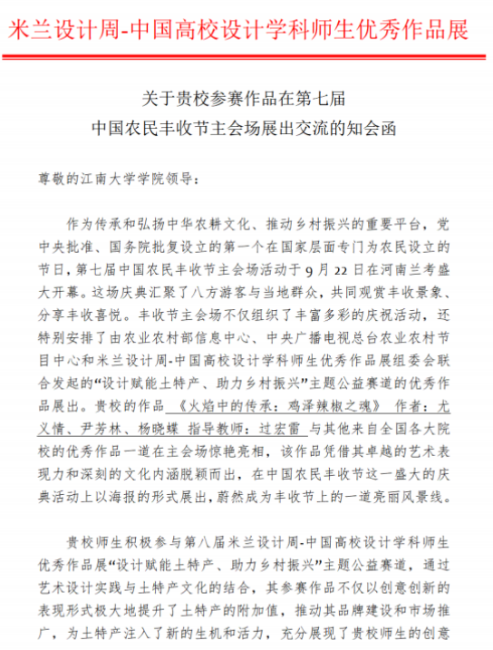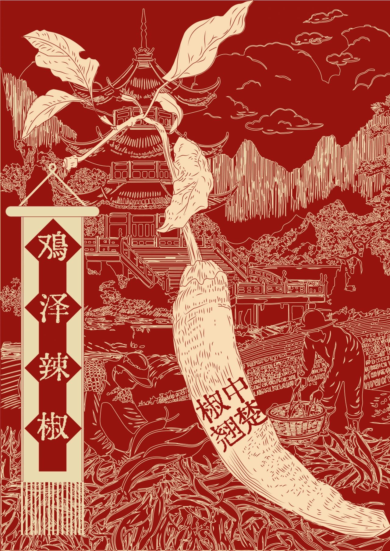 其中,设计学院师生作品《火焰中的传承:鸡泽辣椒之魂》(尤义情、尹芳林、杨晓蝶;指导教师:过宏雷)凭借其卓越的艺术表现力和深刻的文化内涵脱颖而出,在这次庆典活动上以海报的形式展出,蔚然成为丰收节上的一道亮丽风景线。米兰设计周-中国高校设计学科师生优秀作品展组委会向学校发来获奖函表示祝贺。以中国传统版画形式为灵感,这组海报旨在展现鸡泽辣椒的独特魅力和激情,同时突出其作为传统土特产的历史和文化传承。这组海报旨在通过传统的艺术表现形式,将鸡泽辣椒的独特之处和文化内涵传达给观众,引发对于传统土特产的关注和热爱。同时,也表达了对于传统艺术形式的珍视和传承,展现了中华传统文化的魅力和生命力。