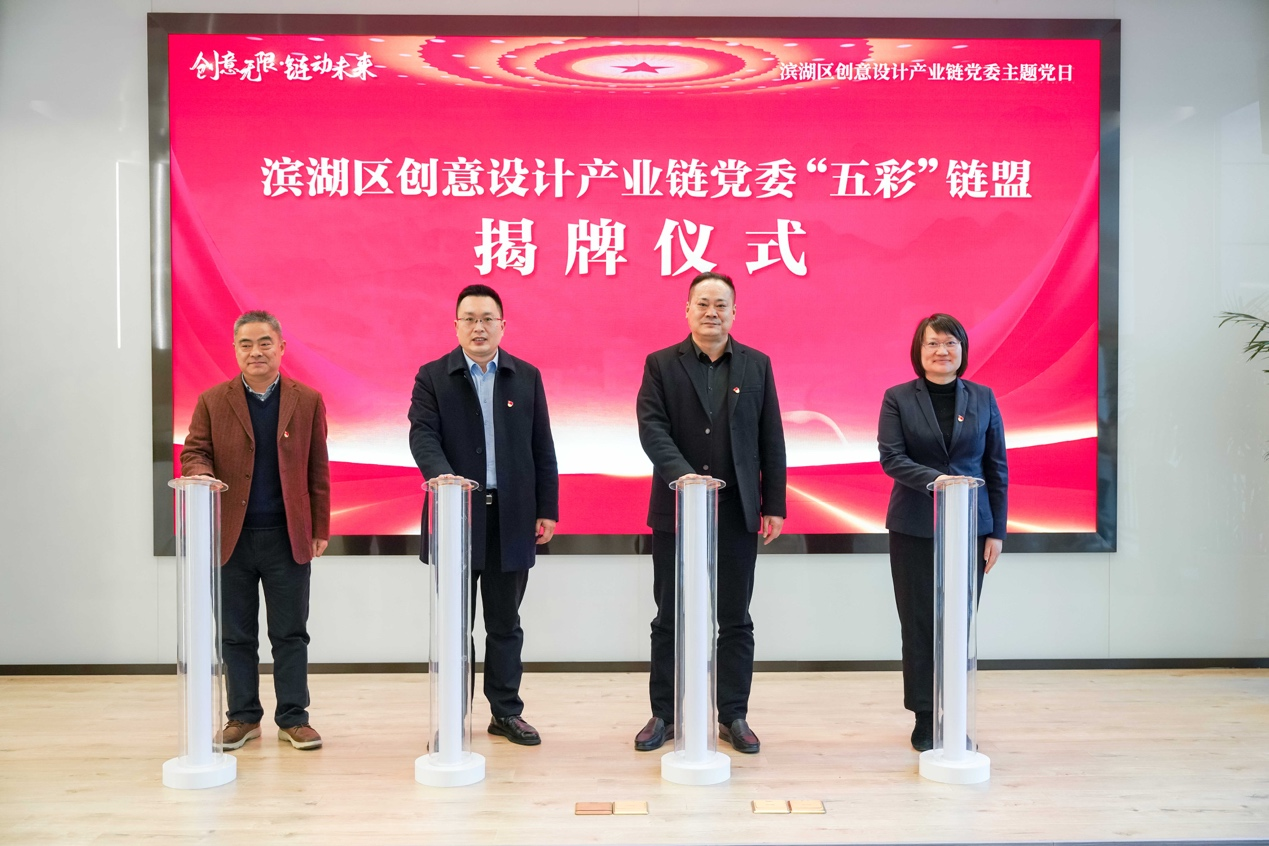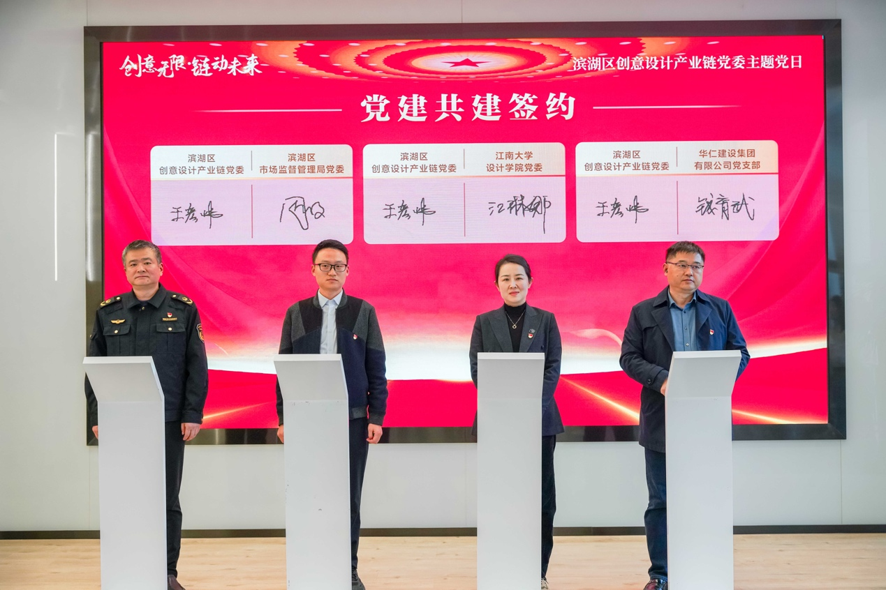 会上,王维青与滨湖区市场监督管理局党委书记、局长王巍,蠡园开发区(蠡园街道)党工委副书记、政协主任李东生,华仁建设集团有限公司党支部书记、董事长袁霞等共同为滨湖区创意设计产业链党委“五彩”链盟揭牌。江琳娜代表设计学院党委与滨湖区创意设计产业链党委、滨湖区市场监督管理局党委、华仁建设集团有限公司党支部签订党建联盟协议,为进一步加强创意设计产业链上政、院、企各方党建共建合作交流提供平台保障。