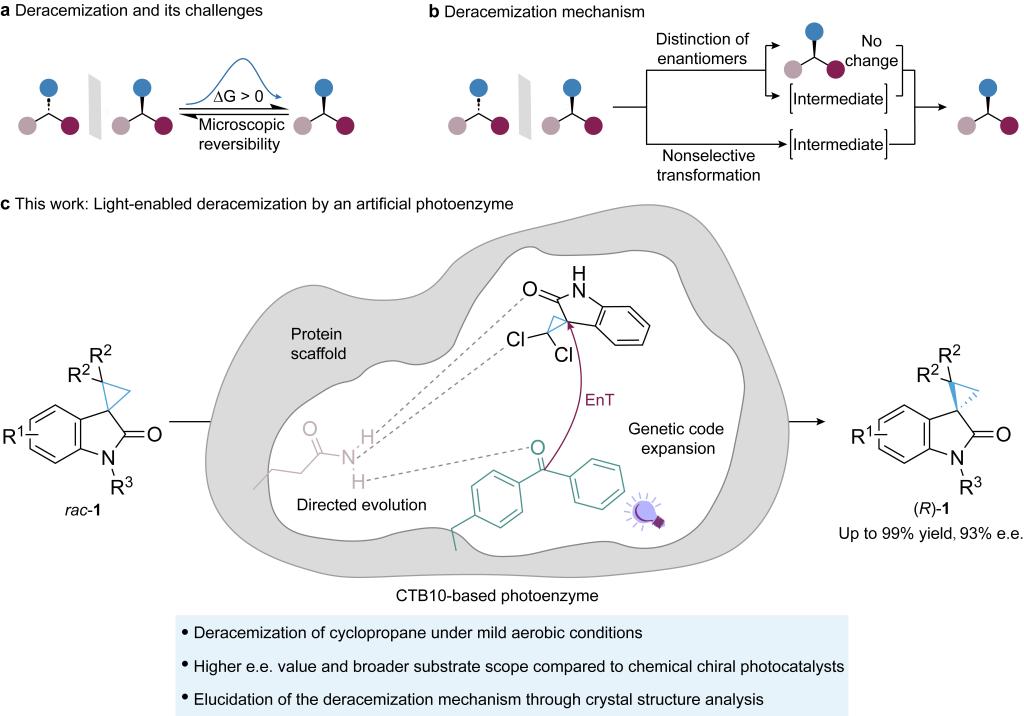 通过设计具有非天然催化活性的酶,为突破传统生物催化的反应限制提供了新策略。该研究基于基因密码子拓展技术成功地将新型蛋白骨架CTB10设计为人工光酶,该酶能够高效催化传统生物催化体系难以实现的热力学不利的环丙烷去消旋化反应。经定向进化后,CTB10光酶展现出广谱的底物适用性和优异的对映选择性(图1)。此外,CTB10光酶-底物复合物的晶体结构清晰地揭示了其手性催化空腔的构效关系,阐明了高效、选择性光驱动去消旋化的结构基础,以上研究为开发具有挑战性的生物催化去消旋化体系提供了新思路。