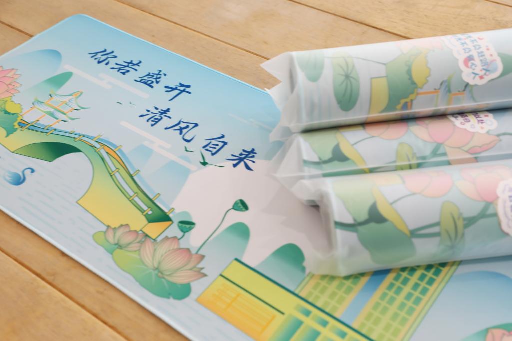 “垫”亮未来:定制一份专属纪念。生物工程学院本科生党支部创新形式,充分结合同学们科研学习、日常工作的使用场景,为毕业生党员每人定制一张党风党纪主题鼠标垫,传递指尖清风。鼠标垫以简笔漫画形式绘以图书馆、曲水桥、黑天鹅、小蠡湖、莲花莲蓬等特色元素,书写“你若盛开 清风自来”主题字样,并印有学院名称和毕业生党员姓名,封装袋上贴有“不负韶华 未来可期”“愿你全力以赴且满载而归”等各色祝福语,引导党员每次移动鼠标都提醒自我遵守党规党纪,清风常伴,坚守初心。