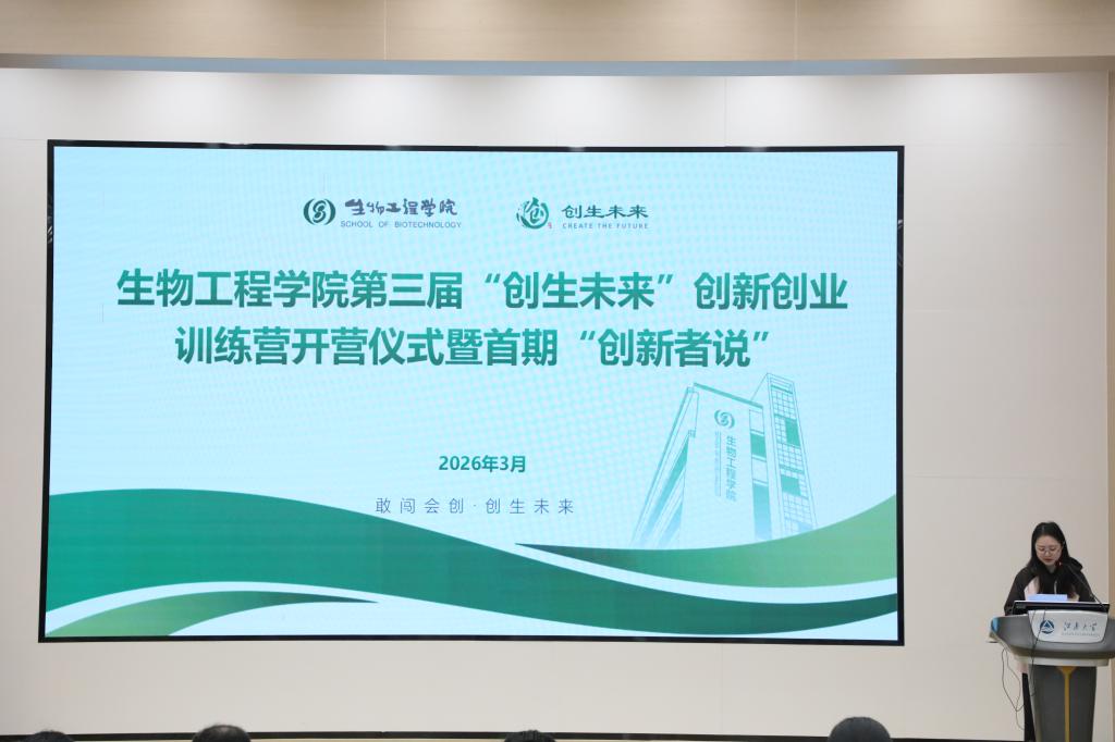 为培养“敢闯会创”的新时代创新型高素质人才,精准选拔和培育一批具有前沿科技内涵与广阔市场前景的优秀项目,3月18日,生物工程学院第三届“创生未来”创新创业训练营开营仪式暨首期“创新者说”在一教1C109举行。生物工程学院党委副书记、副院长林丹,生物工程学院副院长赵鑫锐,校教务处(教师发展中心)、本科招生办公室正科级干部杨宏华,生物工程学院学工办主任兼分团委书记周春江,溢生炬科生物技术(杭州)有限公司总经理贯中正,生物工程学院相关指导老师以及学院2026年参赛学生代表等150余人参会。会议由生物工程学院竞赛专项辅导员刘畅主持。