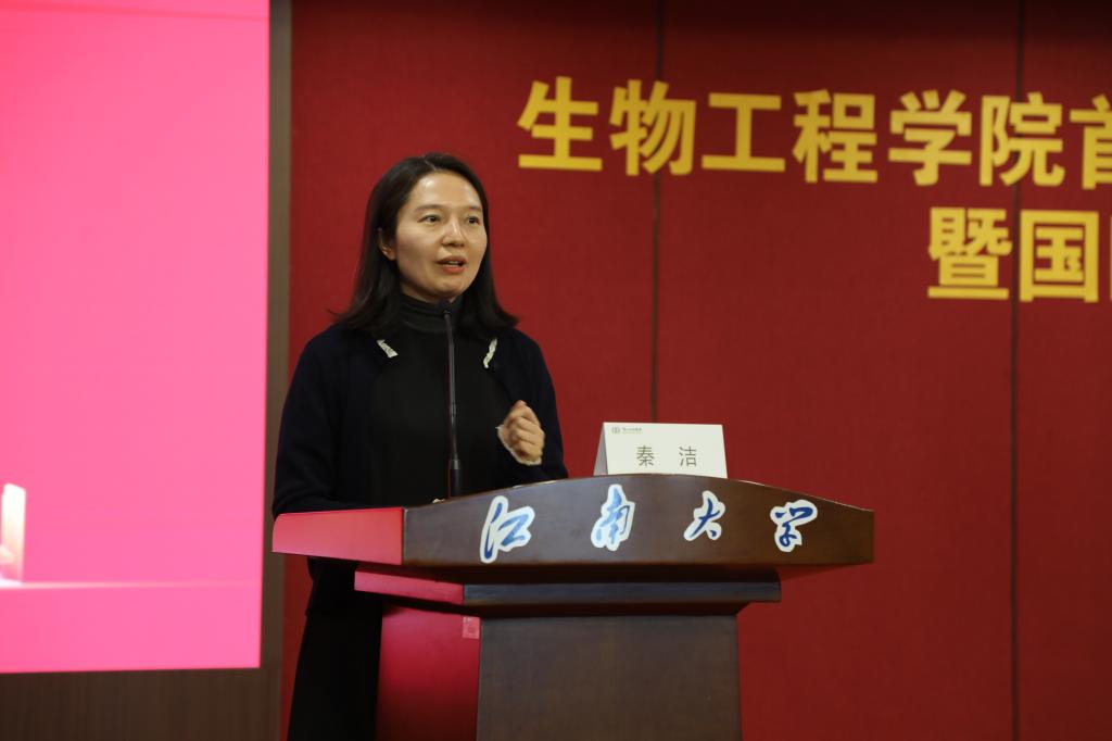 秦洁代表学校国际交流合作处致辞。她对生物工程学院首届国际文化交流月启动表示祝贺,肯定学院在国际交流与人才培养方面的积极探索。她表示,学校将持续为学院国际交流项目提供政策支持与资源保障,鼓励更多学子走出国门、增长见识,在国际舞台展现江南学子风采。