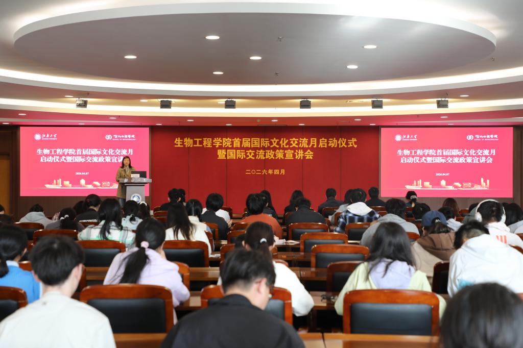 为进一步提升学院国际化氛围,搭建师生国际交流与文化互鉴平台,拓宽学生全球视野,4月7日下午,生物工程学院首届国际文化交流月启动仪式暨国际交流政策宣讲会在蠡湖校区图书馆510多功能厅举行。生物工程学院院长尹健、校国际交流合作处副处长秦洁、生物工程学院副院长聂尧、副院长赵鑫锐、校国际交流合作处学生科科长吴亚雯及学院师生代表共同参与本次活动。仪式由学院党委副书记兼副院长林丹主持。
