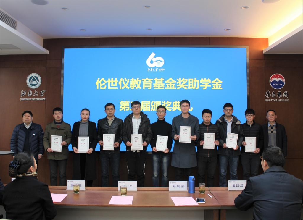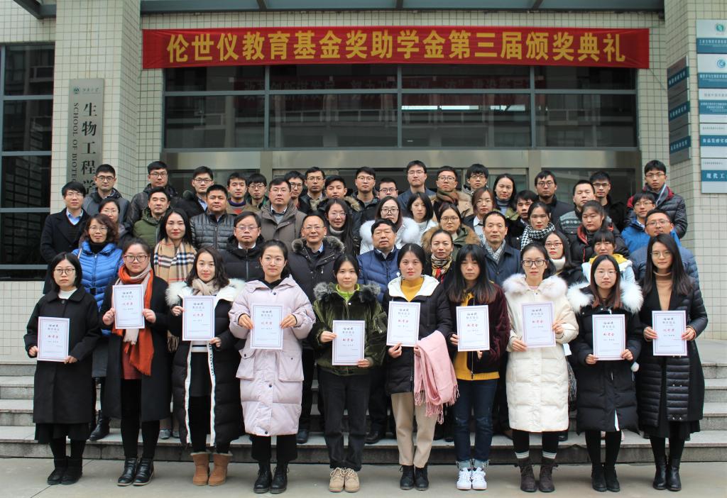 1月2日下午,江南大学第三届“伦世仪教育基金”奖助学金颁奖典礼在生物工程学院茅台厅隆重举行。江南大学校长、“伦世仪教育基金”理事会理事长陈坚院士,浙江商达环保有限公司董事长、理事会副理事长郑展望先生,校长助理、研究生院院长、理事会副理事长兼秘书长堵国成教授,生物工程学院党委书记黄壮霞、副院长刘龙教授、生物系统与生物加工工程研究室主任李江华教授以及研究室其他老师出席颁奖典礼。典礼由生物工程学院党委副书记、副院长陈勇主持。