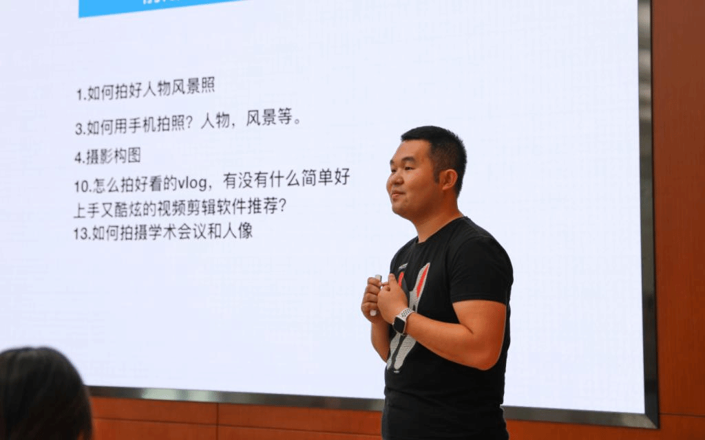 李一关同学从摄影的起源和基本物理原理讲起,深入浅出,逐步引入到拍摄技巧和后期处理,现场掌声不断。他重点围绕如何拍好人物风景照、如何用手机拍照、如何设计摄影构图、如何拍摄学术会议和人像等问题,条分缕析回应现阶段团员青年在日常拍摄中的关切。