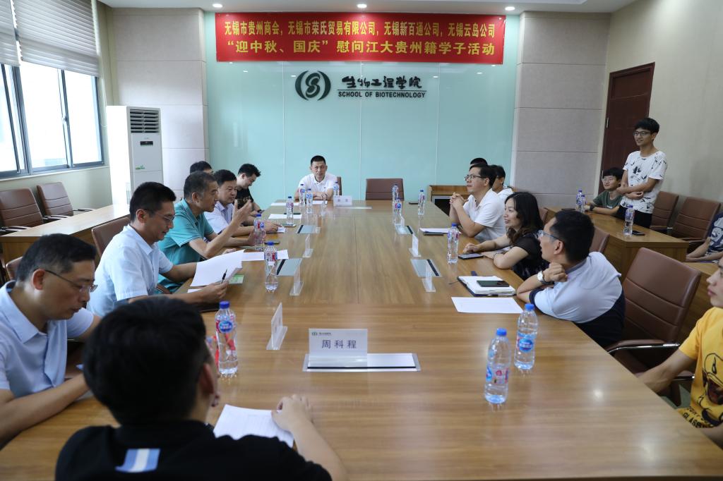 9月10日下午,无锡市贵州商会,无锡市荣氏贸易有限公司,无锡新百通公司,无锡云岛公司“迎中秋、国庆”慰问江南大学生物工程学院贵州籍学子活动在学院古井贡厅成功举办。生物工程学院党委书记黄壮霞、副院长饶志明,无锡市荣氏公司董事长荣礼、副总经理胡健、经理荣嵘、周科程,贵州市商会会长周建强、执行会长赵予黔、秘书长刘廷峰,无锡新百通公司总经理赵军以及贵州籍学子代表参加活动。活动由学院党委副书记兼副院长陈勇主持。