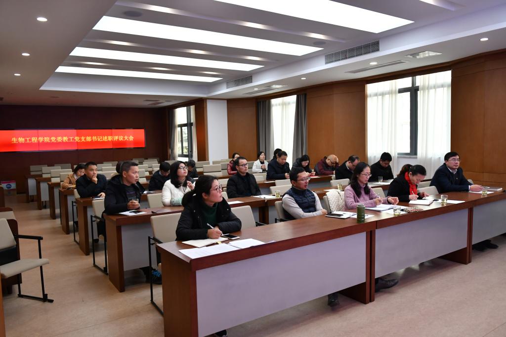 2019年12月14日下午,生物工程学院党委于茅台厅召开2019年度教工党支部书记述职评议大会。生物工程学院党委班子成员,各党支部书记和支部委员、党员代表参加会议。校党委组织部副部长周雪晖同志列席指导。