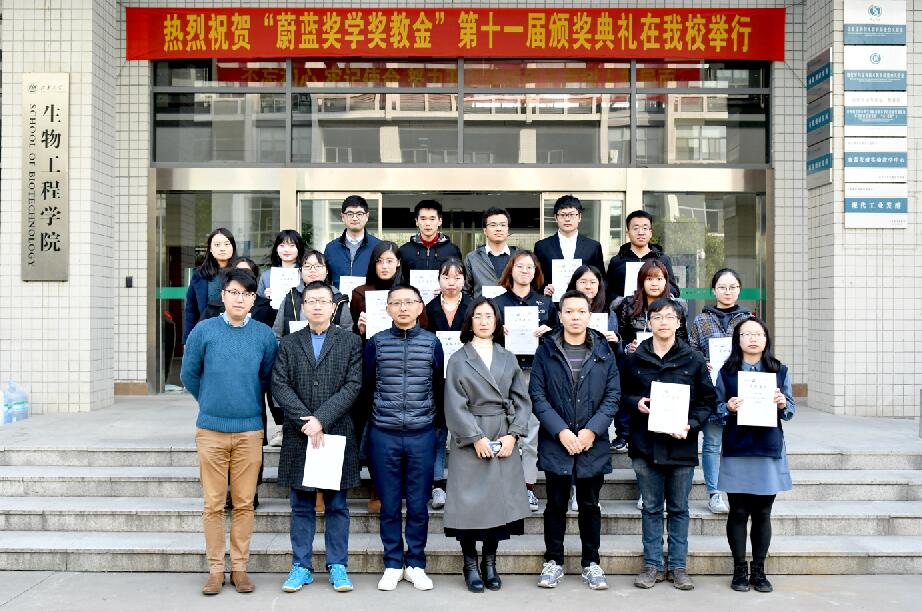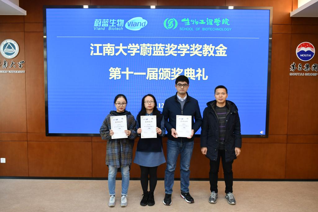 2019年12月11日下午,江南大学第十一届“蔚蓝奖学奖教金”颁奖典礼在生物工程学院茅台厅举行。青岛蔚蓝生物股份有限公司人力资源部总经理郎春燕女士,生物工程学院党委副书记、(兼)副院长陈勇,副院长陈献忠及获奖师生参加颁奖典礼,颁奖典礼由陆燊佳老师主持。