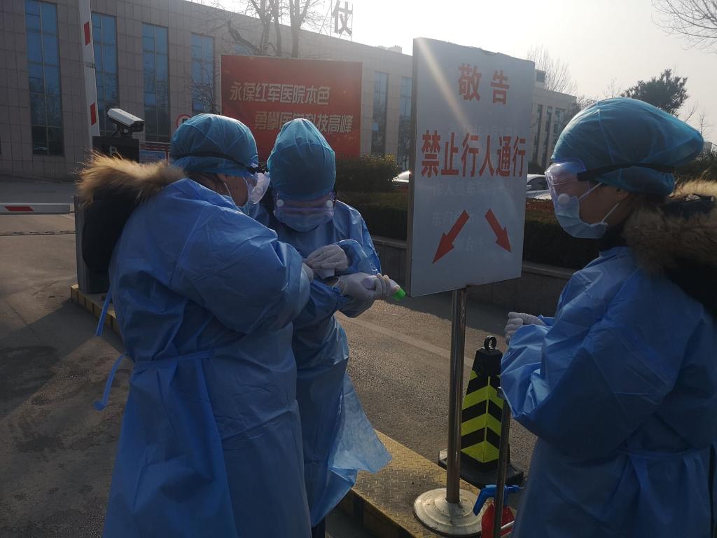在医院门口监测体温的过程中,潘子翯连续几个小时穿着防护服在寒风中站着,呼出的热气在护目镜上聚成水珠,眼前模糊不清。每隔四十五分钟潘子翯就要对现场进行一次消毒。