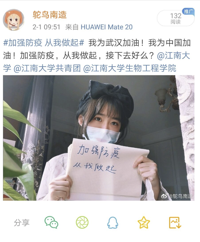 除了参加医院的志愿活动,潘子翯还通过网络参加了学院组织的#加强防疫从我做起#网络防疫传递活动,她希望通过网络把正能量传递给大家。她坚信只要每个人都能做好自己份内的事情,光明就不会太远!