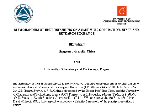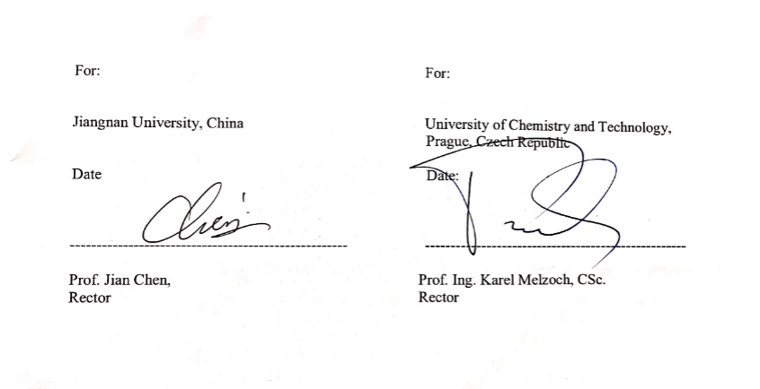 为进一步推进我校“轻工技术与工程”一流学科建设,拓展国际交流与合作,2018年以来,在学校指导下,生物工程学院与捷克布拉格化工大学通过互访就双方共同感兴趣的合作点进行了多轮次的研讨。近期,两校正式签署校际合作协议,旨在建立两校之间的长期友好合作关系,推进并加快落实校际合作办学机构或项目的设立,并在生物工程类研究生的联合培养、博士双学位授予以及科学研究等方面进行深度合作。协议的签订与实施将进一步助推我校轻工技术与工程学科国际影响力的提升。
