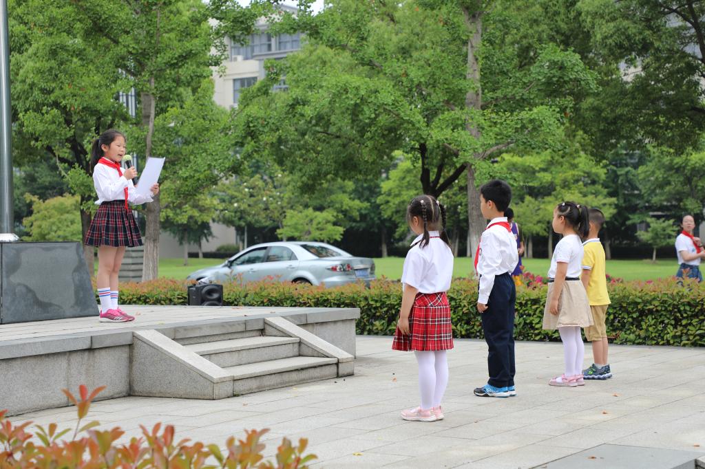 随后,在飘扬的五星红旗下,小学生代表陈奕轩进行国旗下演讲,诉说对祖国的热爱和赞美,立志要做有理想、有本领、有担当的新时代好少年。在场师生共同合唱歌曲《少先队队歌》、《歌唱祖国》。