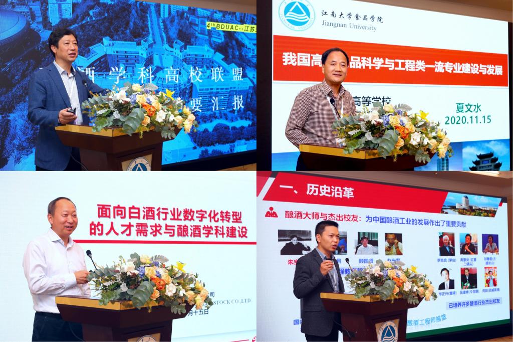 联盟秘书长、四川轻化工大学副校长罗惠波,教育部食品类专业教指委秘书长、江南大学教授夏文水,江苏今世缘酒业股份有限公司副董事长吴建峰,江南大学生物工程学院副院长陈献忠分别以《联盟年度工作报告及中国白酒学院产教融合发展经验交流》《我国食品科学与工程类一流专业建设与发展》《面向白酒行业数字化转型的人才需求与酿酒学科建设》《具有江南风格的酿酒工程专业建设》为题作大会报告。