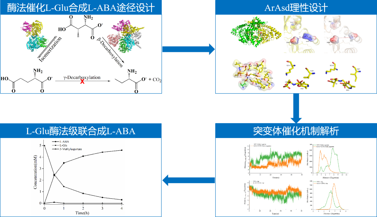 为实现L-Glu中γ位羧基的去除,本研究提出利用谷氨酸变位酶(glutamate mutase,GM)和天冬氨酸β-脱羧酶(L-aspartate-β-decarboxylase,Asd)级联催化L-Glu合成L-ABA的新途径:GM首先将L-Glu转化为L-3-甲基-天冬氨酸(L-3-Met-Asp),再由Asd通过β-脱羧生成L-ABA。虽然GM可以将L-Glu转化成L-3-Met-Asp,然而由于Asd严格的底物选择性特点,无法转化L-3-Met-Asp生成L-ABA。课题组以一种高活性Asd为原始酶,经同源建模及结构分析,首先对底物通道进行改造,获取对L-3-Met-Asp具有催化能力的突变体K18A;在此基础上通过活性中心周围的位点改造,获得了催化活力进一步提升的突变体K18A/V287I。最终,利用GM与Asd的突变体K18A/V287I级联催化,成功实现将L-Glu转化为L-ABA,转化率达到98.9%。本研究成果不仅建立了从L-Glu到L-ABA的酶法合成的新途径,展现了巨大的应用前景,也为非天然氨基酸的酶法合成途径提供了新的思路。