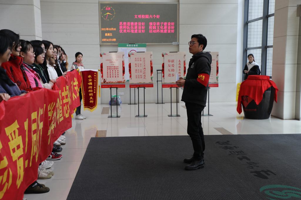 周云龙首先做动员讲话,他从雷锋为人民服务的故事切入,结合祁发宝等卫国戍边英雄怀着“清澈的爱 只为中国”的信念,把青春、鲜血乃至生命留在喀喇昆仑高原,筑起巍峨界碑的感人事迹,引发同学们对雷锋精神的深入思考。他鼓励同学们,学习雷锋精神就是把“爱国”两个字放在心里,践行在平常、融入在日常、重点在经常。站在两个一百年的交汇点上,新时代青年要把全心全意为人民服务、投身社会主义现代化强国建设,切切实实地落在行动上。