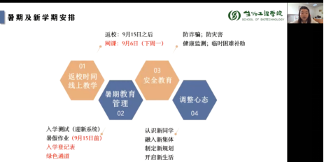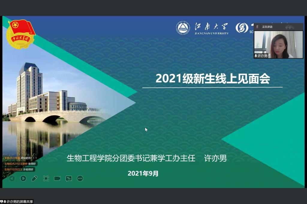会议伊始,周云龙为新生线上见面会致辞,向2021级本科新同学表示热烈的欢迎,并介绍江南大学办学历史、校训理念及生物工程学院历史沿革、师资生源等情况。他表示,新同学们的加入为学院增添了新的活力。接着,周云龙围绕“如何开启人生新阶段”的主题,对新生们提出三点建议:一是树立远大理想,探寻大学意义;二是勤于实践锻炼,养成创新意识;三是保持热情活力,不负青春时光。许亦男以学院优秀学子为切入点,为新同学们介绍了第二批全国高校“百名研究生党员标兵”雷庆子,“至善特别荣誉生”方佳华,“赤水河”特称团支部书记郎绪涛,“最佳拍档”闫行越、张一蕊等同学,她希望新同学们能够从身边的榜样中汲取前进的力量。接着,许亦男介绍了学院多样的团学工作,鼓励同学们积极参加校园文化活动和学生组织,助力个人成长。杨燕萍围绕“教务管理政策”的主题,为同学们介绍了江南大学及生物工程学院人才培养方案、学籍管理、课程修读和教务管理系统的使用,并分享了《本科生学习指导手册》,指出同学们即将在网上迎来充实忙碌的新学期,希望同学们调整作息,准时上课,完成相应的学业任务。韩俊就新生暑期教育管理及学校新学期开学安排进行了梳理,并对学生进行了安全教育,提醒同学们防范电信诈骗,注意人身安全,加强自我健康监测和体育锻炼。同时鼓励同学们及时调整假期状态,积极结交新同学、融入新集体、制定新规划,收获充实而灿烂的大学生活。