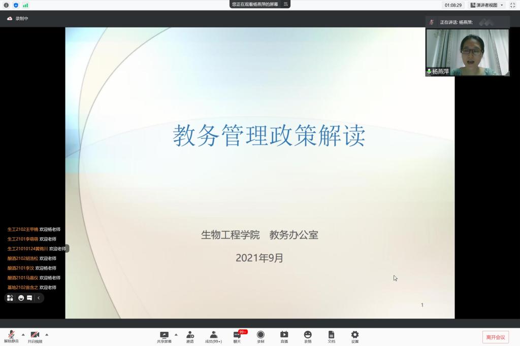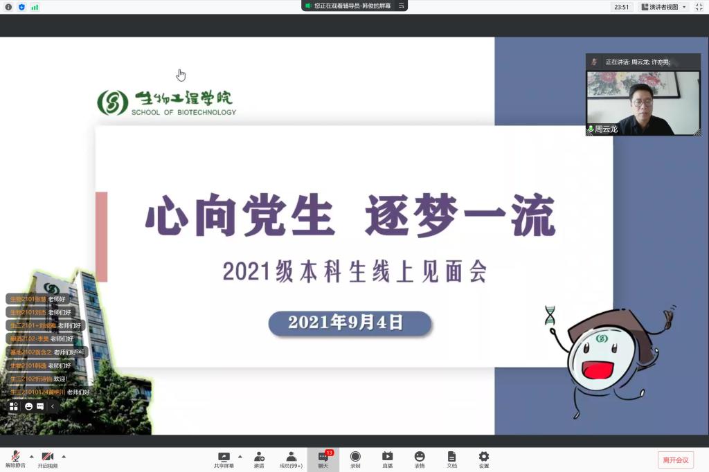 为增进新生归属感,更好地开展新生入学教育和管理。生物工程学院于9月4日上午召开2021级本科生线上见面会。生物工程学院党委副书记周云龙、分团委书记许亦男、教务办本科生教务秘书杨燕萍以及260余名新生与家长共聚云端。见面会由2021级本科生辅导员韩俊主持。