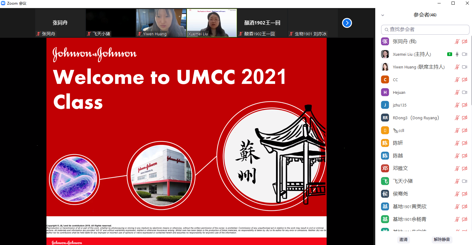 11月27日下午,生物工程学院与强生(苏州)医疗器材有限公司2021年度校企合作课程(医疗器械和制药微生物学UMCC模块)开班并进行第一次授课。强生(苏州)公司微生物质量及无菌保证(MQSA)总监刘雪美、MQSA高级研究员黄奕雯、MQSA经理朱健杰、MQSA研究员董薷阳,生物工程学院辅导员张同舟等参加活动。本次课程通过线上举行。