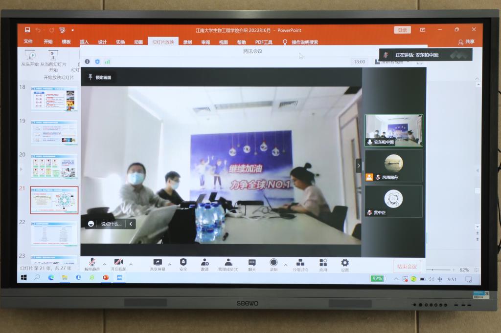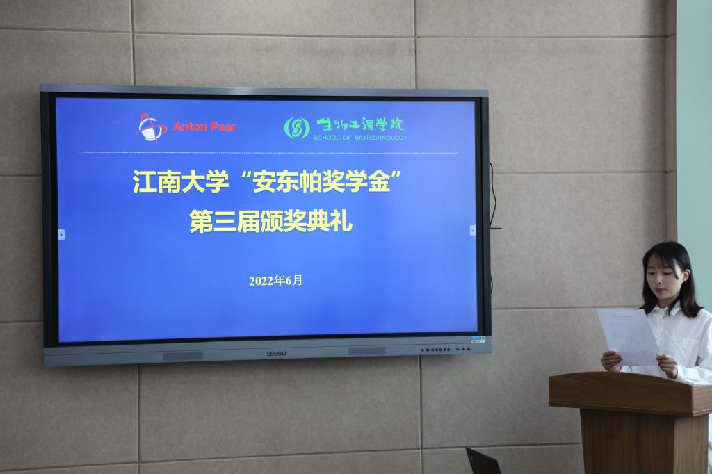 6月8日上午,江南大学第三届“安东帕奖学金”颁奖典礼暨云端校企交流会以线上线下相结合的形式举行。安东帕(上海)商贸有限公司市场部经理畅良艳、实验室销售经理陈希、销售副总程张红,生物工程学院李崎教授、副院长陈献忠、钮成拓副研究员及获奖学生参加活动,会议由辅导员张同舟主持。