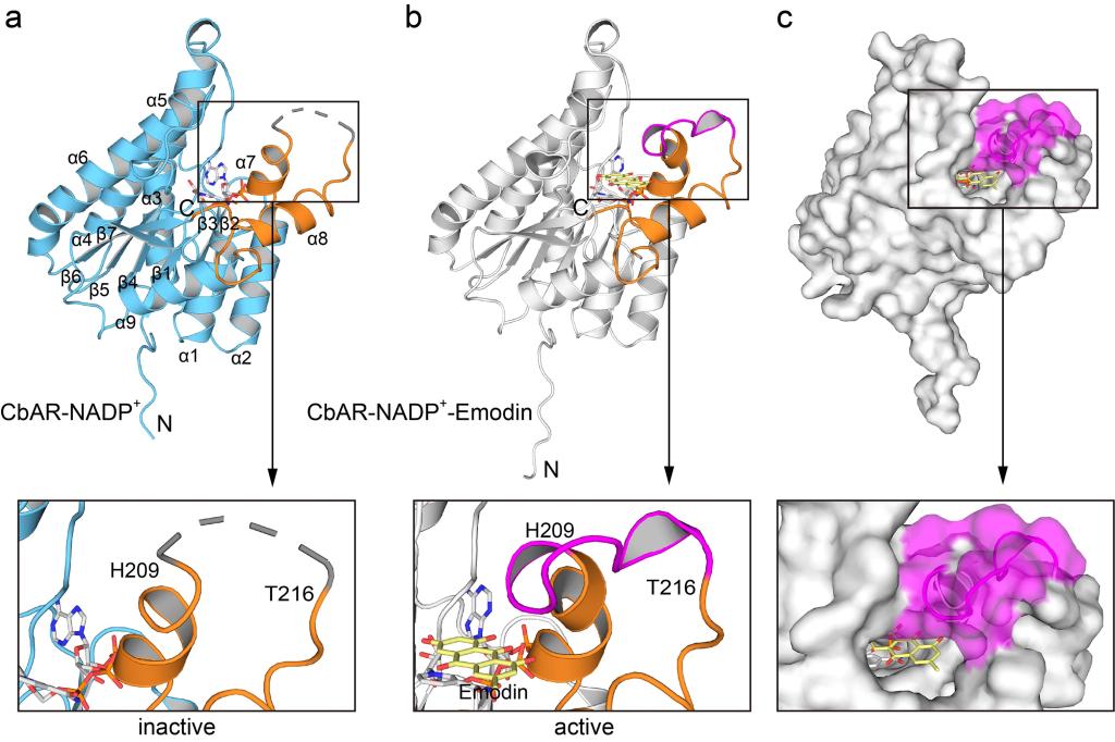 Molecular insights and characterization of emodin recognition and binding of CbAR.
