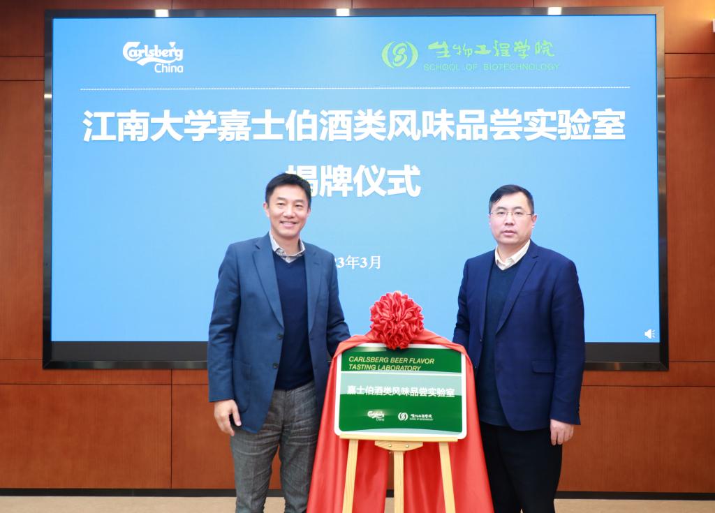 随后,谢夷和周云龙、刘龙进行校企合作捐赠签约仪式、生物工程学院理事单位签约仪式。为感谢嘉士伯中国对学院发展的支持,学院特将酒类风味品尝实验室命名为“嘉士伯酒类风味品尝实验室”,汤澍浩和刘龙共同为实验室揭牌。为激励更多生工学子努力学习,刻苦钻研,推进酿造行业发展,嘉士伯中国还捐赠设立了江南大学“嘉士伯奖学金”,汤澍浩和刘龙共同为首届获奖学生颁奖。颁奖典礼结束后,汤澍浩一行参观了“嘉士伯酒类风味品尝实验室”,企业同仁还和获奖学生就学习科研情况、职业发展规划进行了座谈交流。