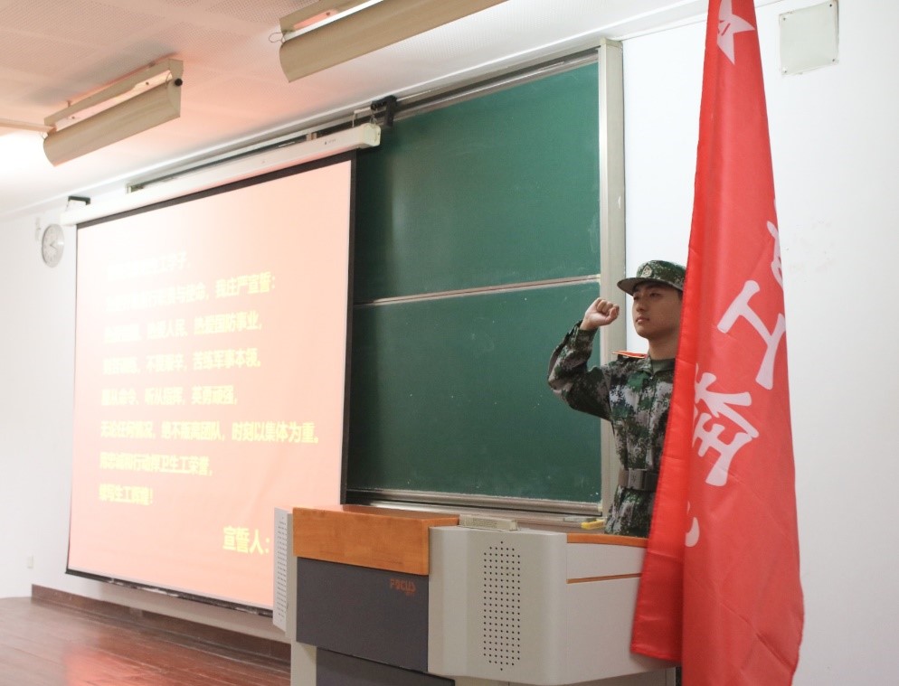 接着,周杰从军训人员编排、军训内容、内务标准、作息时间、成绩考核、温馨提示等六个方面介绍了本次军训的总体安排,在激励参训学生积极参训同时也提出学生要注意安全,劳逸结合。随后,2023级本科生代表王泽霖举起军训旗帜,带领全体参训同学宣誓。在铿锵有力的军训誓词中,全体参训新生激情澎湃,展现出生工学子超凡魄力。生工学子定能以青春之名,应军训无限挑战;以少年之梦,将热血挥洒四方。