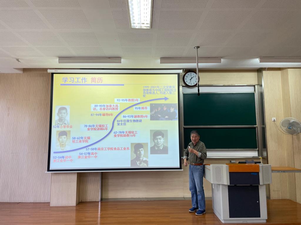 讲座伊始,诸葛健老师介绍了自己成长学习经历。少年时特殊的家境和独特的人生体验塑造了不畏艰苦、敢冒风险、勇于独立的精神品质。他以亲身经历讲述人生两次重要拐点:考入南京工学院食品工业系就读发酵专业和拒绝加拿大移民邀请甘愿奉献祖国。诸葛健老师以此勉励学生“学一行、干一行、爱一行才有出息”并且要有为国家发展奉献的信念决心。
