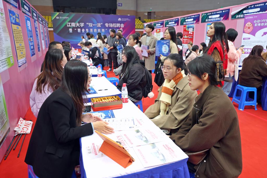 吴莹从人才落户、大学生补贴、交通文旅补贴以及青年人才驿站等四个方面介绍了无锡市青年人才政策。名城孕育名校,名校服务名城。“双一流”的江南大学与“太湖明珠”无锡之间从来都是相融共生的关系。据悉,在本次招聘会提供的岗位中,有近半数来自无锡,留锡就业已成为广大毕业生的最佳选择之一。
