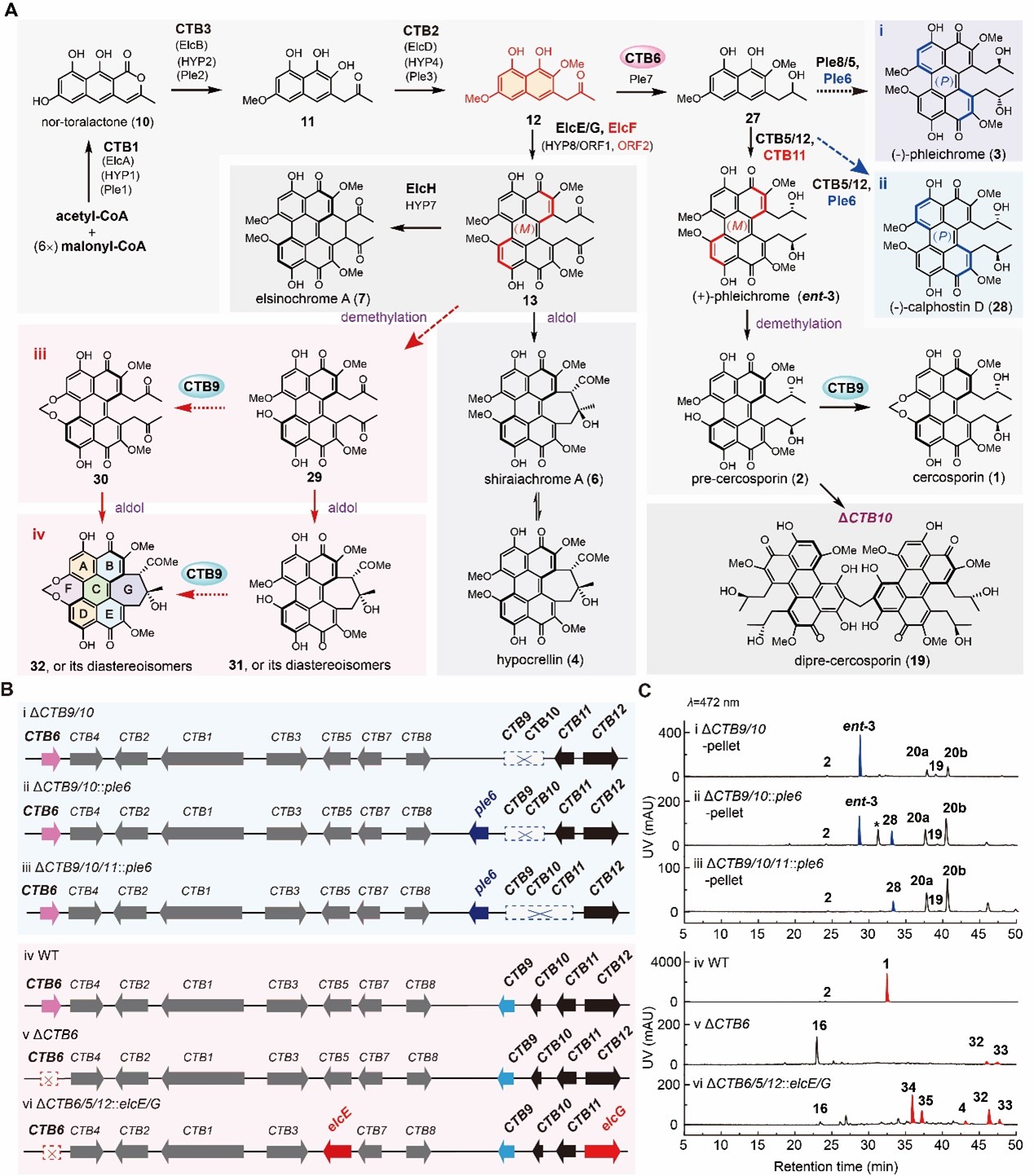 首先,作者以实验室分离保存的尾孢菌素高产菌株Cercosporasp. JNU001为研究对象,通过基因敲除、体外重构以及生物信息学分析揭示了B类苝醌天然产物由共同前体经分支酶的修饰形成产物多样性和复杂性的机制,然后以尾孢菌素生物合成基因簇为模板,通过分支酶的敲除和引入获得了一系列重编程的基因簇,不仅实现了苝醌化合物轴手性的改造,还获得了一系列具有不同取代基的非天然苝醌化合物。此外,作者对关键分支酶的底物混杂性进行了详细的测试,为其他非天然苝醌化合物的定向生物合成提供指导。