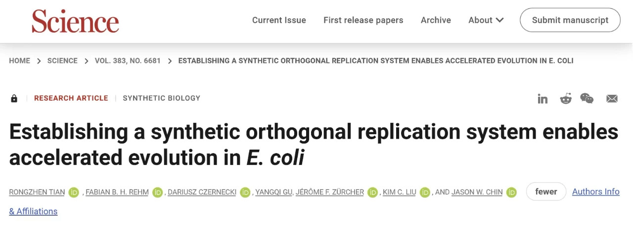 近日,来自英国剑桥MRC分子生物学实验室(MRC-LMB)的Jason Chin教授团队在国际顶尖学术期刊Science发表了题为Establishing a synthetic orthogonal replication system enables accelerated evolution inE. coli的文章,我校生物工程学院2022届博士校友田荣臻为论文第一作者及共同通讯作者。