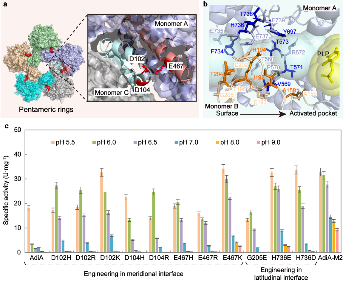 蛋白质同源寡聚是自然进化过程中形成的一种常见蛋白质特性,约一半的蛋白质以同源寡聚体形式存在。寡聚结构的稳定对蛋白质的功能活性和稳定性有重要影响,然而,在实际应用中,存在寡聚蛋白质的实际催化环境不利于其寡聚结构形成的情况。碱性丁二胺的关键合成酶——酸诱导型精氨酸脱羧酶AdiA是一种典型的十聚体同源寡聚蛋白,其活性结构为由五个二聚体组成具有中心对称结构的双层五元环。每个二聚体中由于单体交叉互扣形成了两个中心对称的活性口袋和底物通道,但单独的二聚体结构松散,只有形成双层环状十聚体时,才能较好地催化精氨酸脱羧。由于AdiA表面有大量酸性氨基酸,其十聚体结构仅在酸性环境下(pH<6.0)稳定存在,而在中性和碱性条件下,大部分AdiA以二聚体或单体形式存在,加之胍丁胺酶SpeB的最适pH为碱性,使得AdiA与SpeB级联催化合成丁二胺的生产效率受到限制。