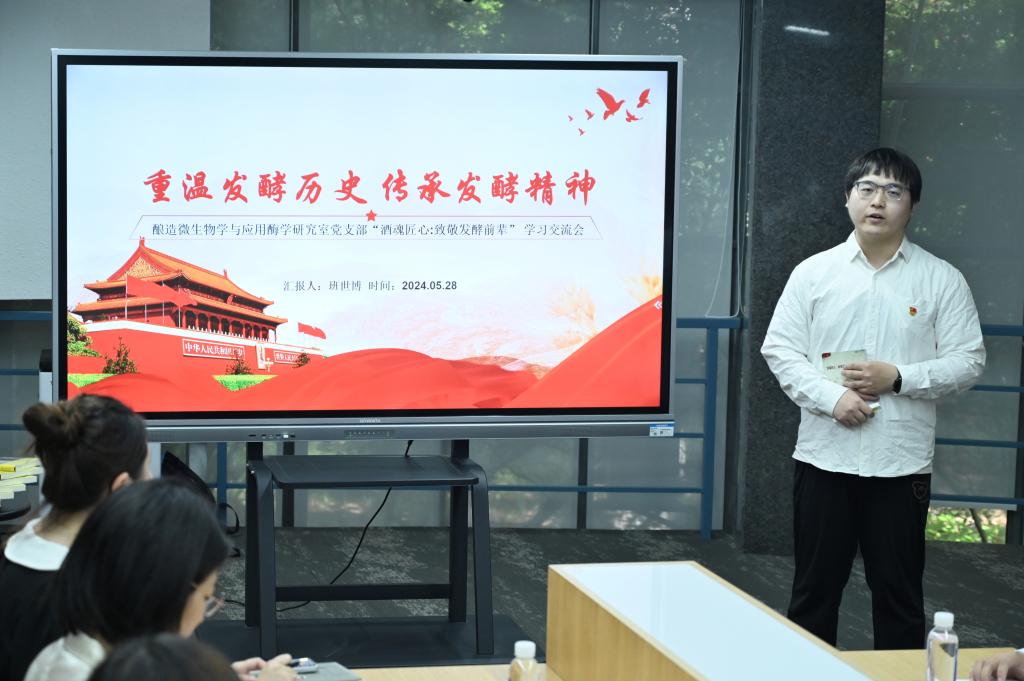 交流会在生物工程学院酒科技馆举办,旨在带领师生沉浸式体悟发酵之光、学科力量。通过回顾第106期朱宝镛大讲堂暨中国酿酒大师访谈会现场,引出“致敬发酵前辈 吾辈勇担使命”的交流话题。党支部成员、2021级博士生班世博以“重温发酵历史 传承发酵精神”为主题展开分享,讲述中引经据典,带领师生重温那段峥嵘岁月,结合科研实际,他提到“发酵工程领域的前辈们引领发酵学科前进,作为行业后辈,当以前辈为榜样,站在巨人的肩膀上发奋图强。”