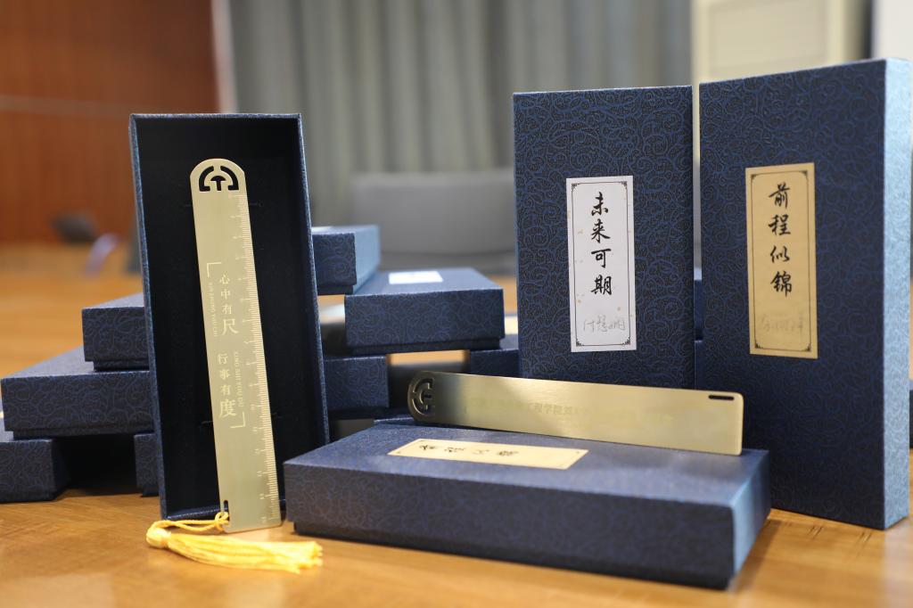 同时,本科生党支部还为毕业生党员每人定制一把集书签和度量功能于一身的黄铜尺,正面刻字“心中有尺 行事有度”,背面刻以学院名称和毕业生党员姓名,盒面书写“前程似锦 未来可期”,引导党员坚守纪律规矩,勇于砥砺前行。