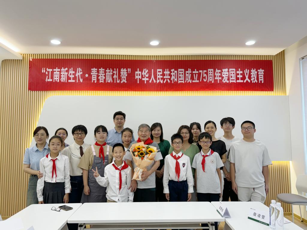 诸葛健老师以“我是中国人,我爱中国,我希望中国繁荣昌盛”的响亮口号表达了江南生工人对祖国的深情与承诺,接着他以自身“少先队员岁月”“海外求学”“攻坚克难技术瓶颈”等话题分享爱国情怀,激励新一代青年学好核心知识、报效祖国。随后,教职工子女代表詹凌萱、周沐凡为诸葛健老师献花、敬献红领巾。最后,诸葛健老师为参加活动的教职工子女颁发爱国主义课堂结业证书。